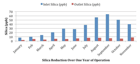 The power plant was originally commissioned in 1997. The demineralization plant consisted of a two pass RO unit with inter-pass caustic dosing followed by a conventional polishing EDI unit. Due to frequent scaling, the EDI performance was not stable and did not consistently meet the plants requirements. Shortly after the plant’s commissioning, a rental mixed bed polisher was installed to meet the water quality.