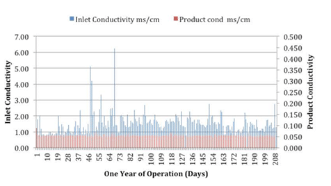The FEDI system’s treated water quality is consistently in the range of 0.055‐0.06 μS/cm and contains less than 10 ppb of silica. These results exceeded the customer’s specifications. Due to FEDI’s unique dual voltage design, periodic cleanings are not required and the system is able to continuously meet these requirements.