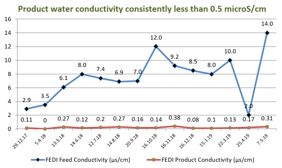 Since the client’s plant was designed with a single-pass RO, the hardness in the RO permeate was expected to be in the range of 3ppm. Careful selection of the EDI technology was required to ensure that the system would not require frequent chemical cleaning on account of hardness scaling and would operate without interruption.