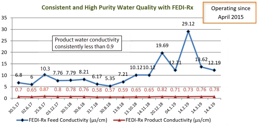 - An EDI which could deliver consistent product water quality on a continuous basis irrespective of variation in feed water conditions.