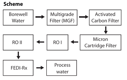 The water source for the plant is brackish well water. The process scheme chosen to treat this water to generate high purity water consisted of pretreatment followed by two pass RO and electrodeionization.