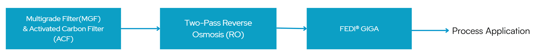 The system integrates multiple advanced water treatment technologies, including multigrade and activated carbon filters, two-pass reverse osmosis (RO) for advanced desalination and impurity removal, and the FEDI® GIGA for the final polishing step. The FEDI® GIGA can be seamlessly integrated into an RO skid, maximizing space efficiency and reducing the overall system footprint.